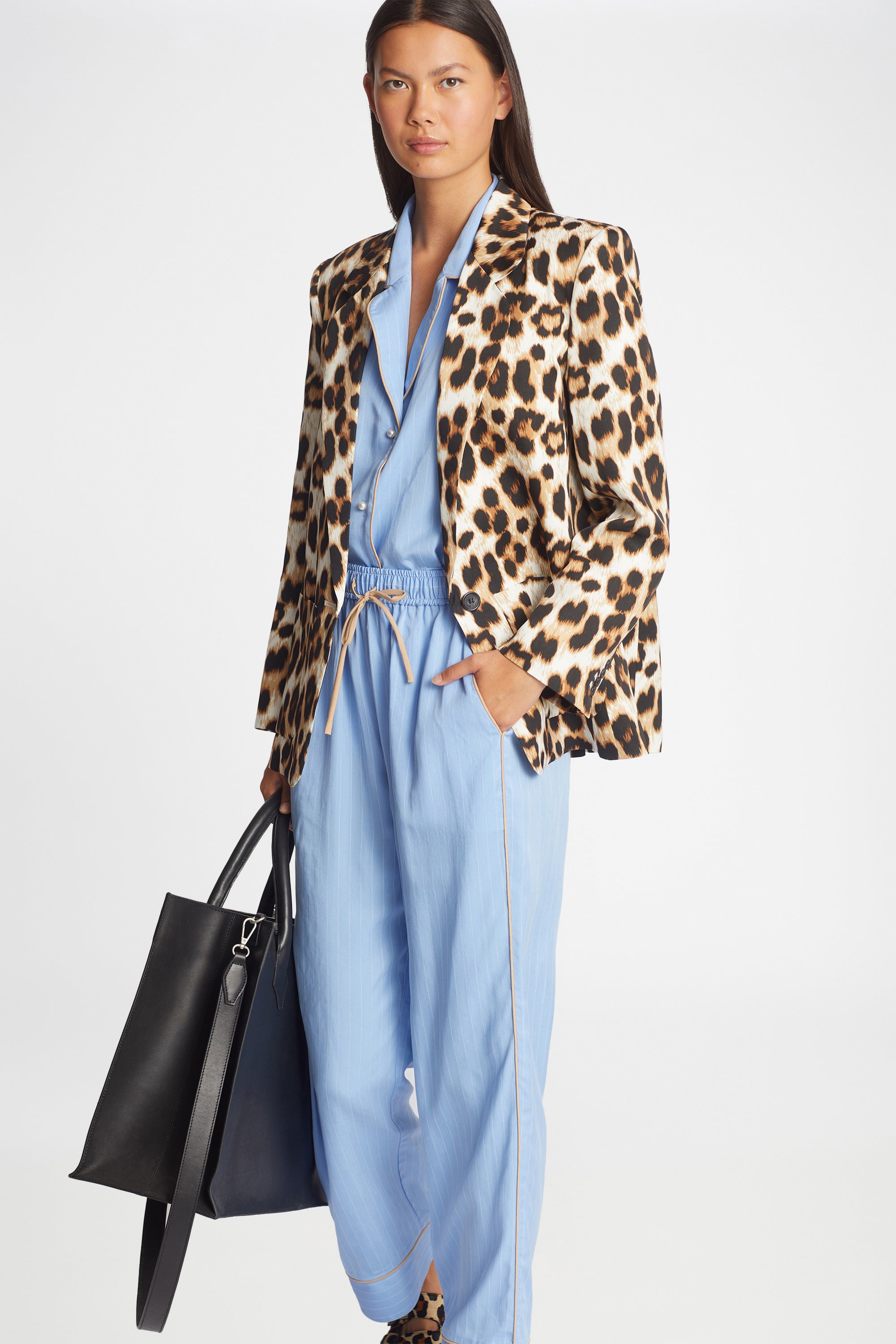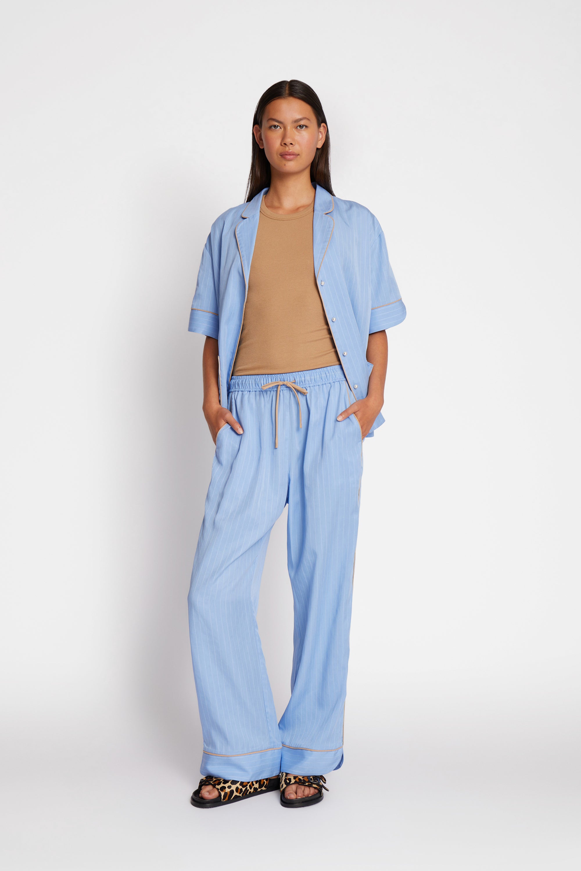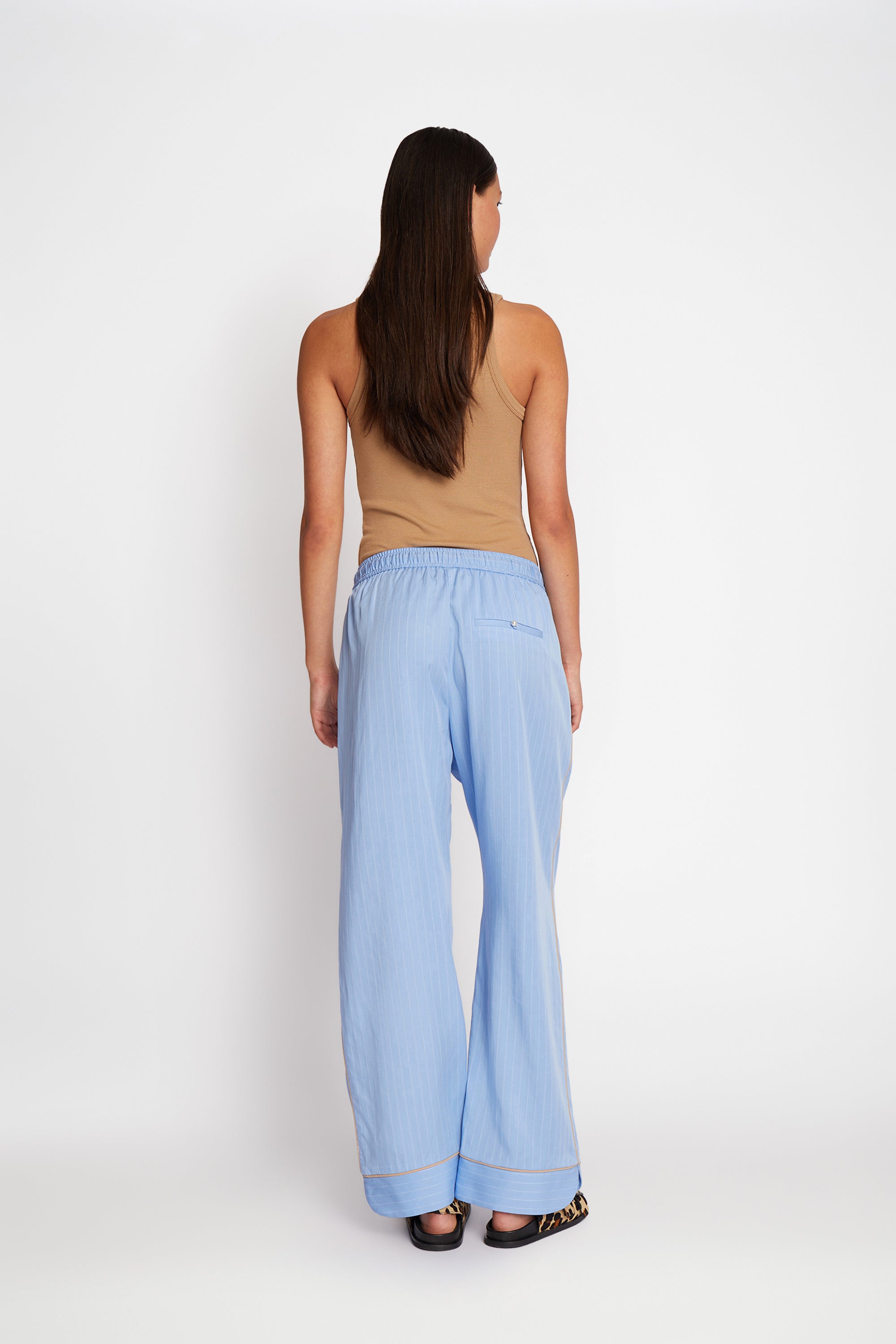 Elegant pinstriped trousers with beautiful beige piping details. The trousers have pockets and are tied with a fine tie string at the waist.