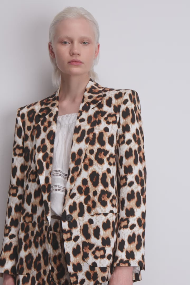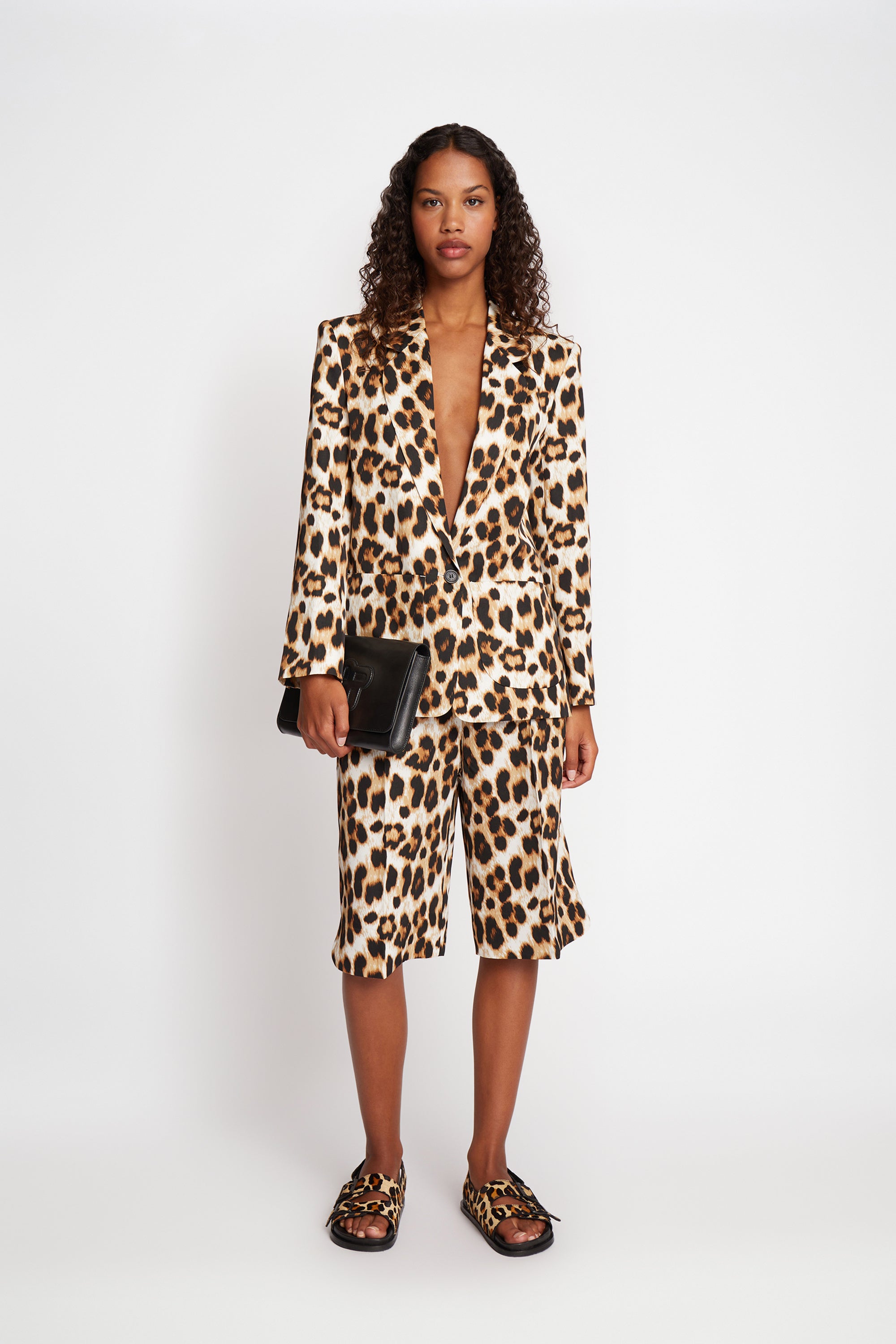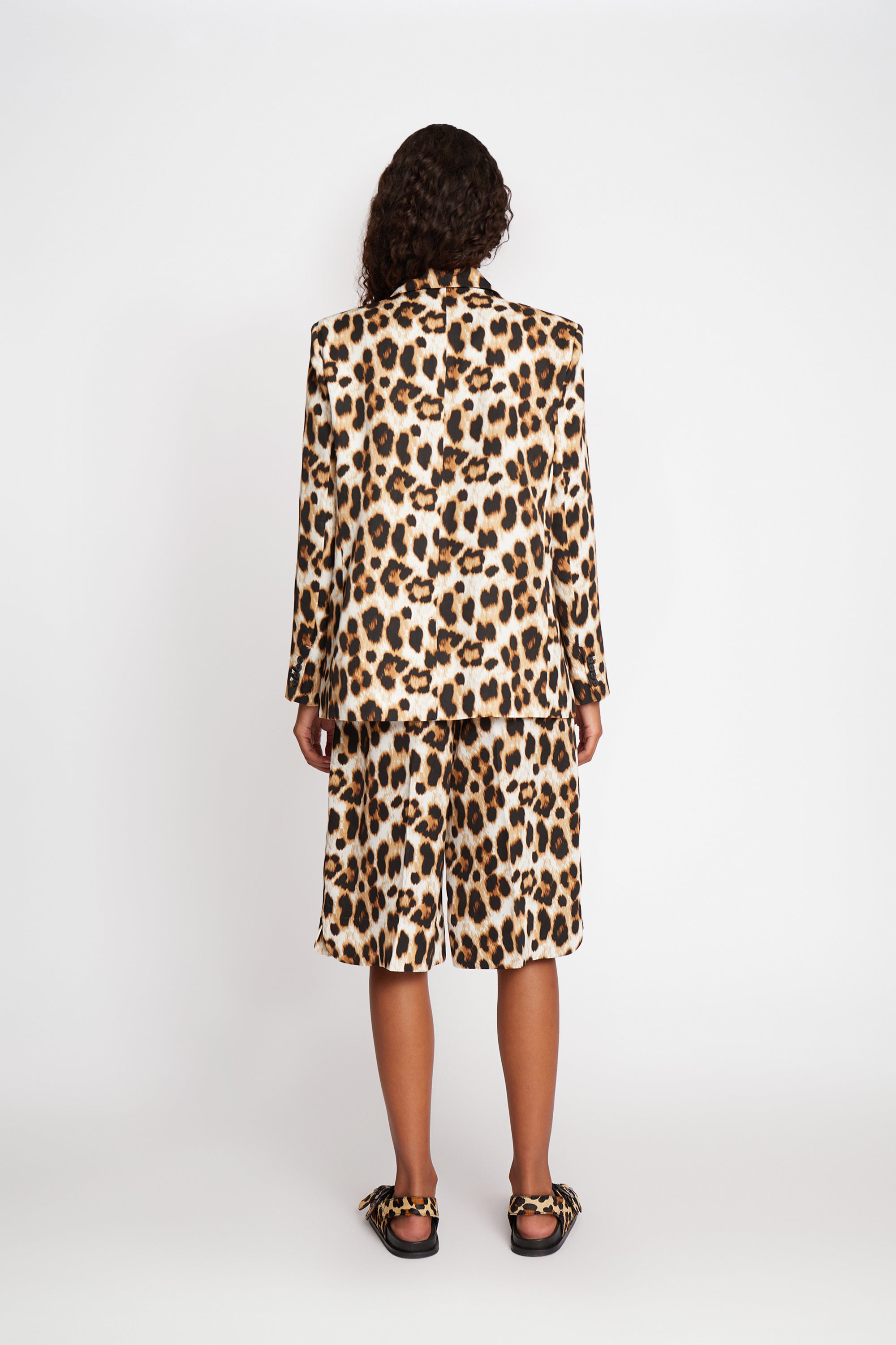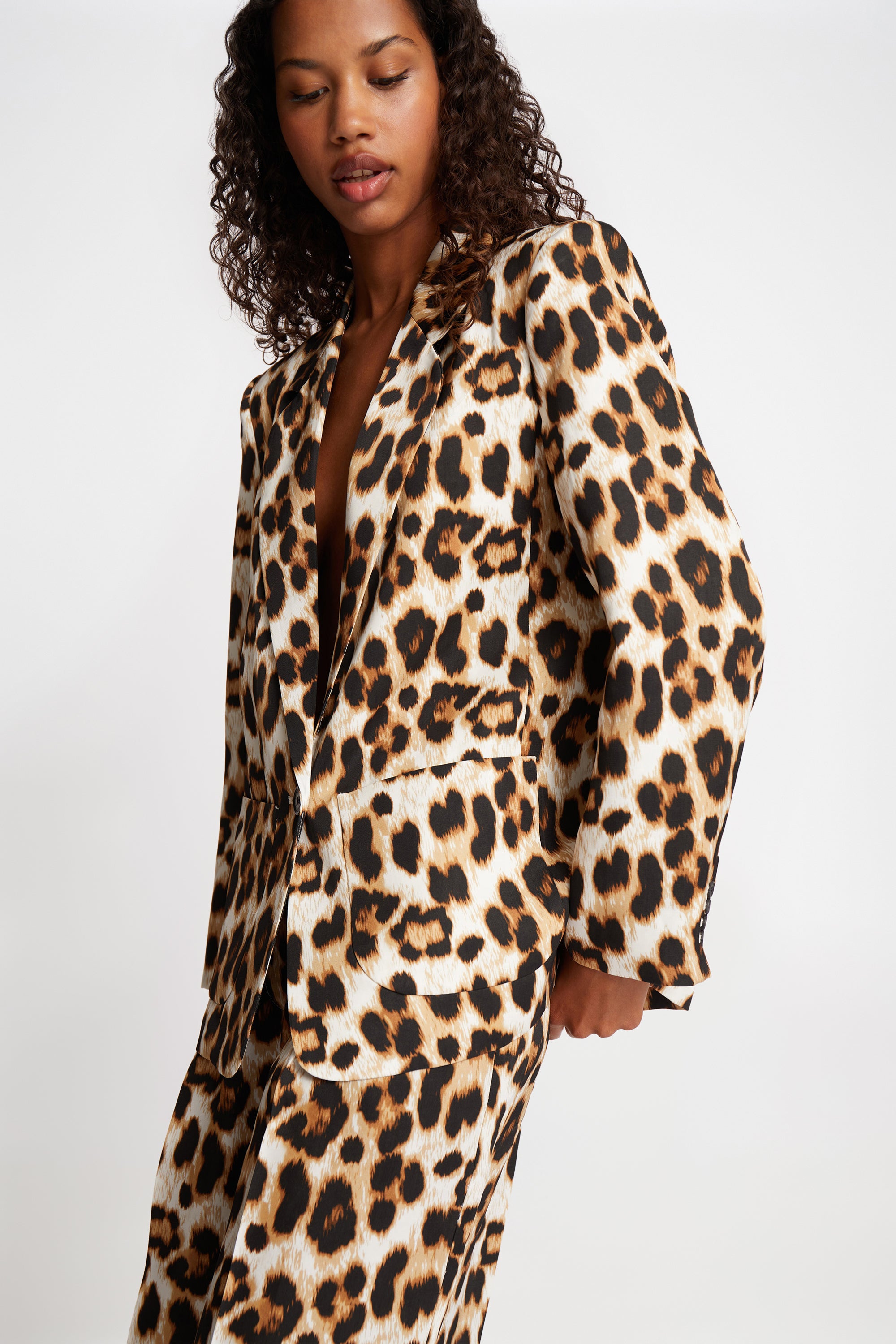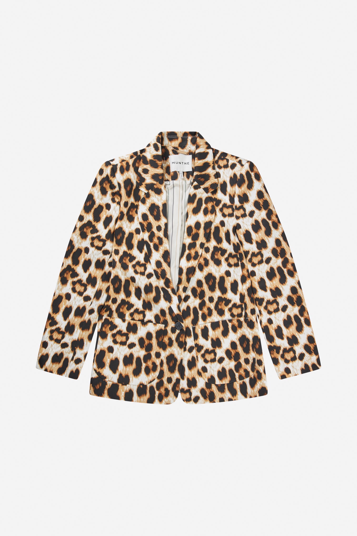 Blazer with a beautiful all-over leo print, with elegant pockets and a single button closure. The jacket is designed with a beautiful pinstripe lining.