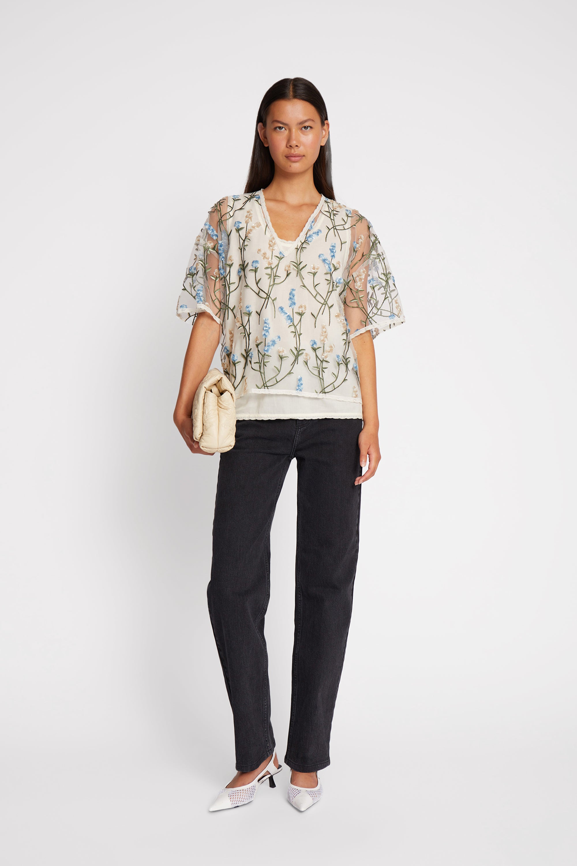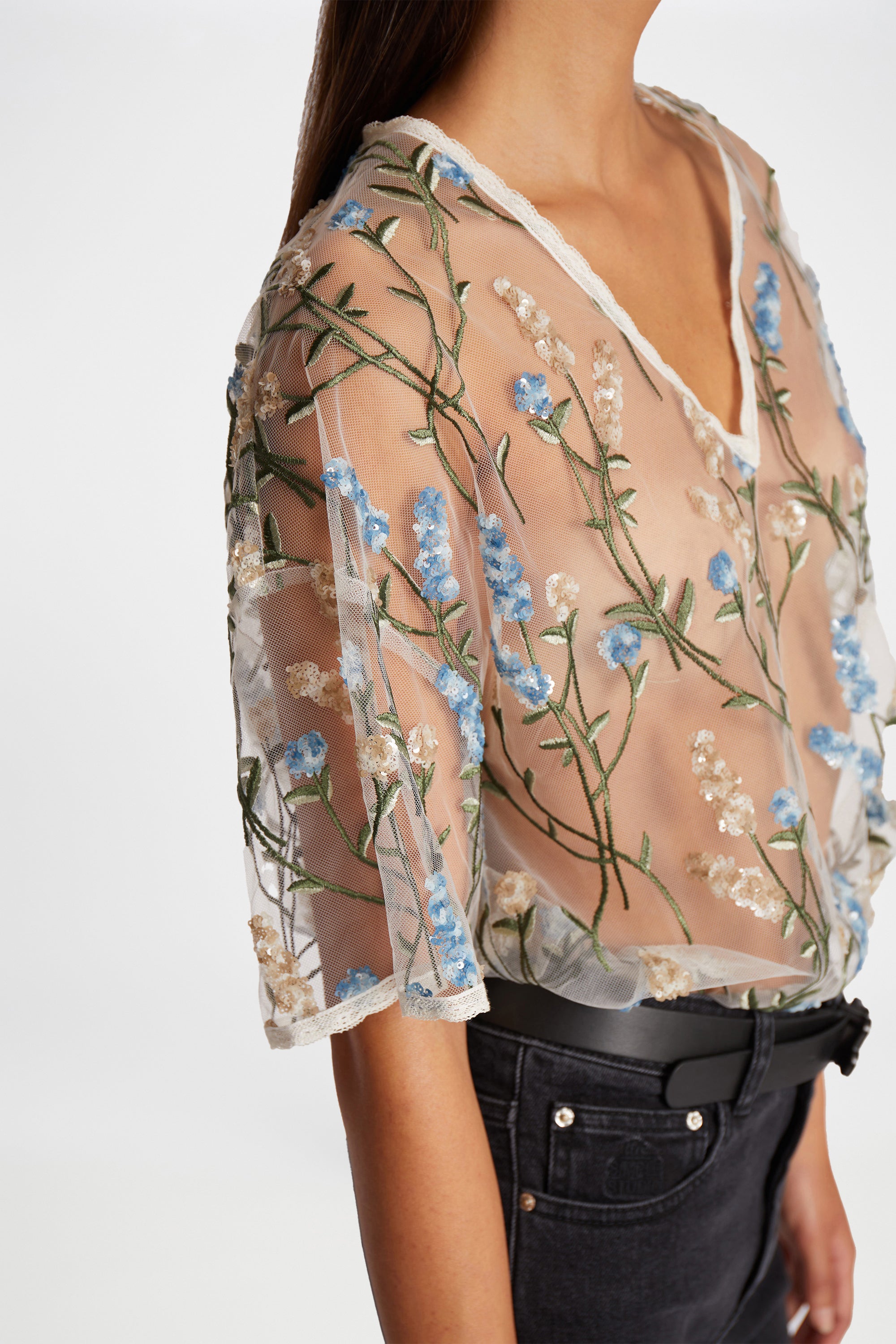 A beautiful blouse designed with an elegant mix of sequins and embroidery, creating a beautiful flower pattern. The blouse is designed to be transparent with an elegant slip top underneath and has a round neck and a loose fit.