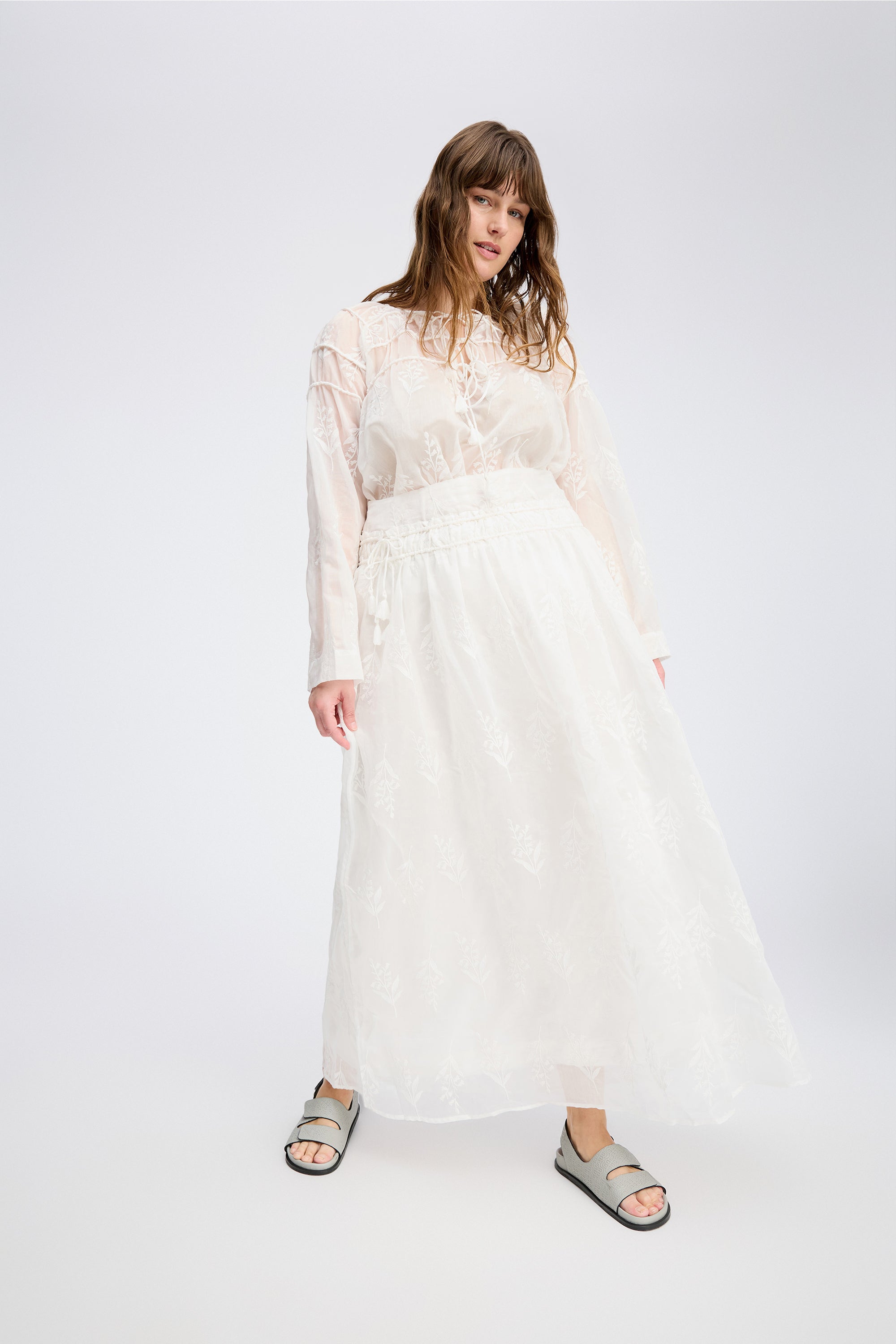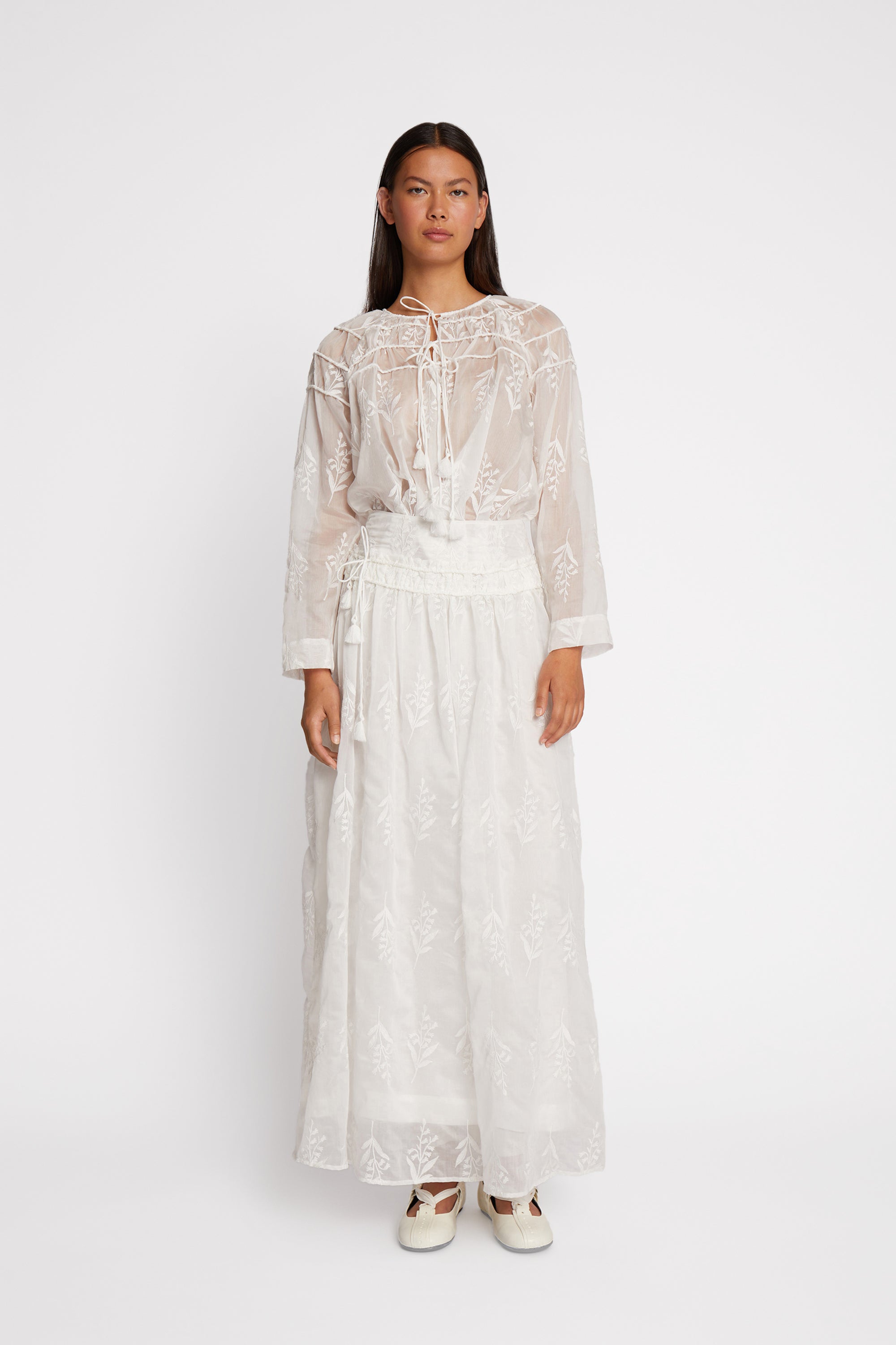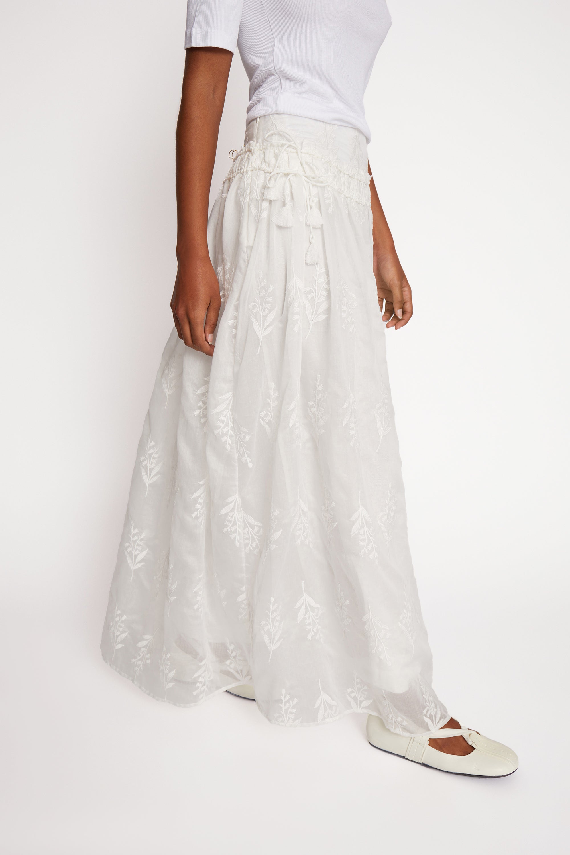 Skirt with a fine floral embroidery, and a beautiful tie detail at the hip. Each tie ends elegantly with small, fine tassels.