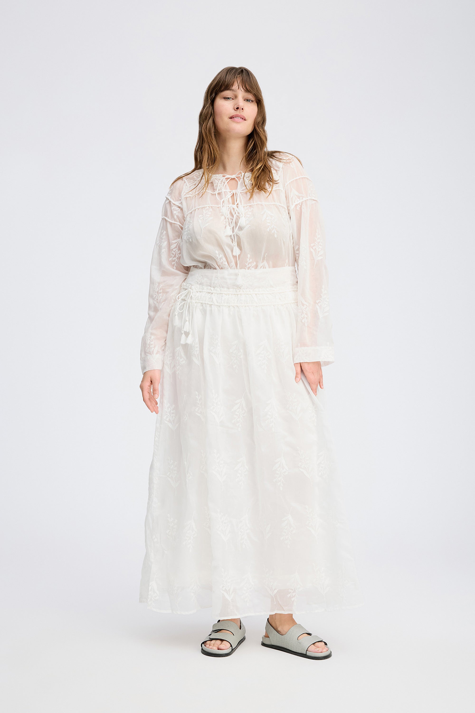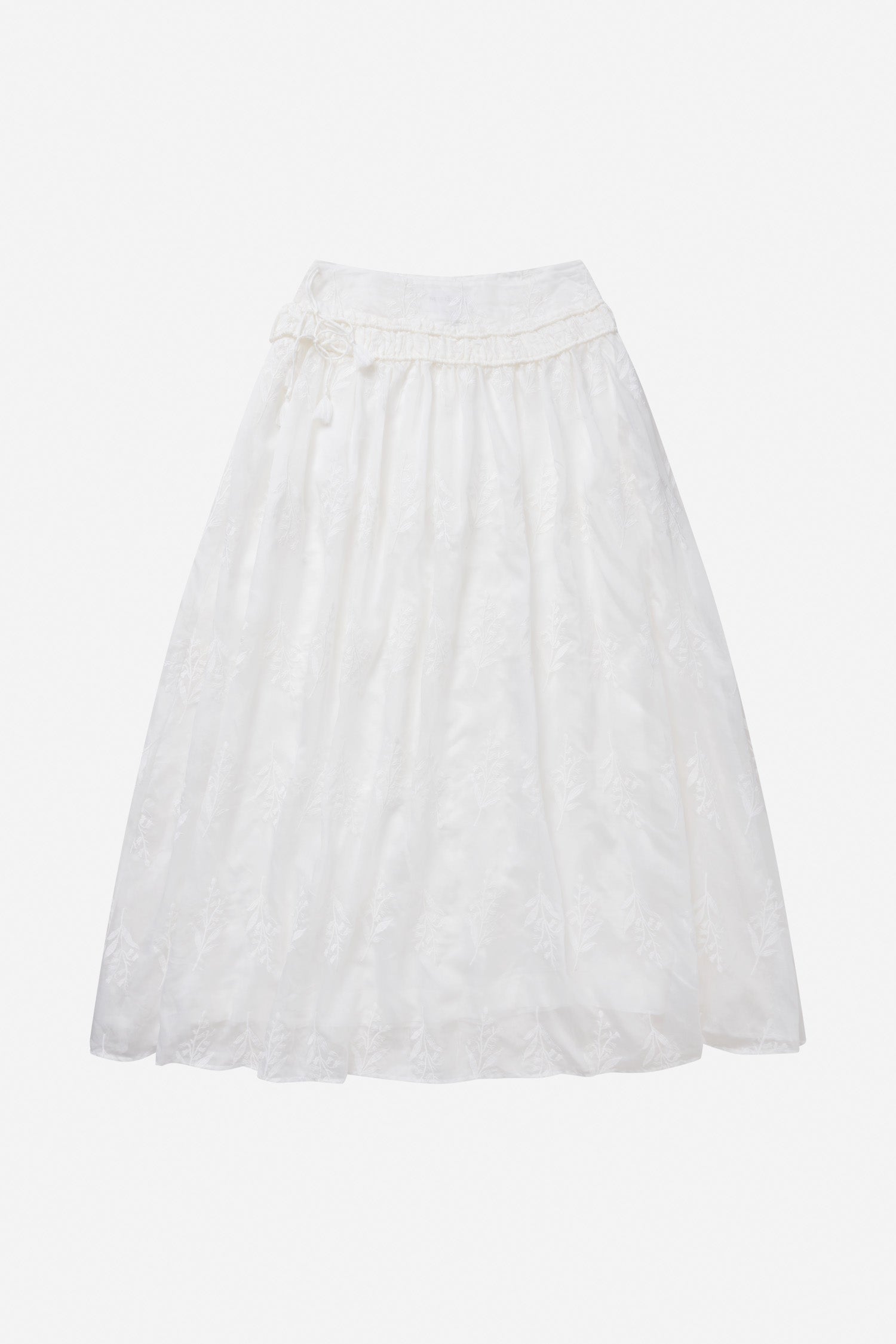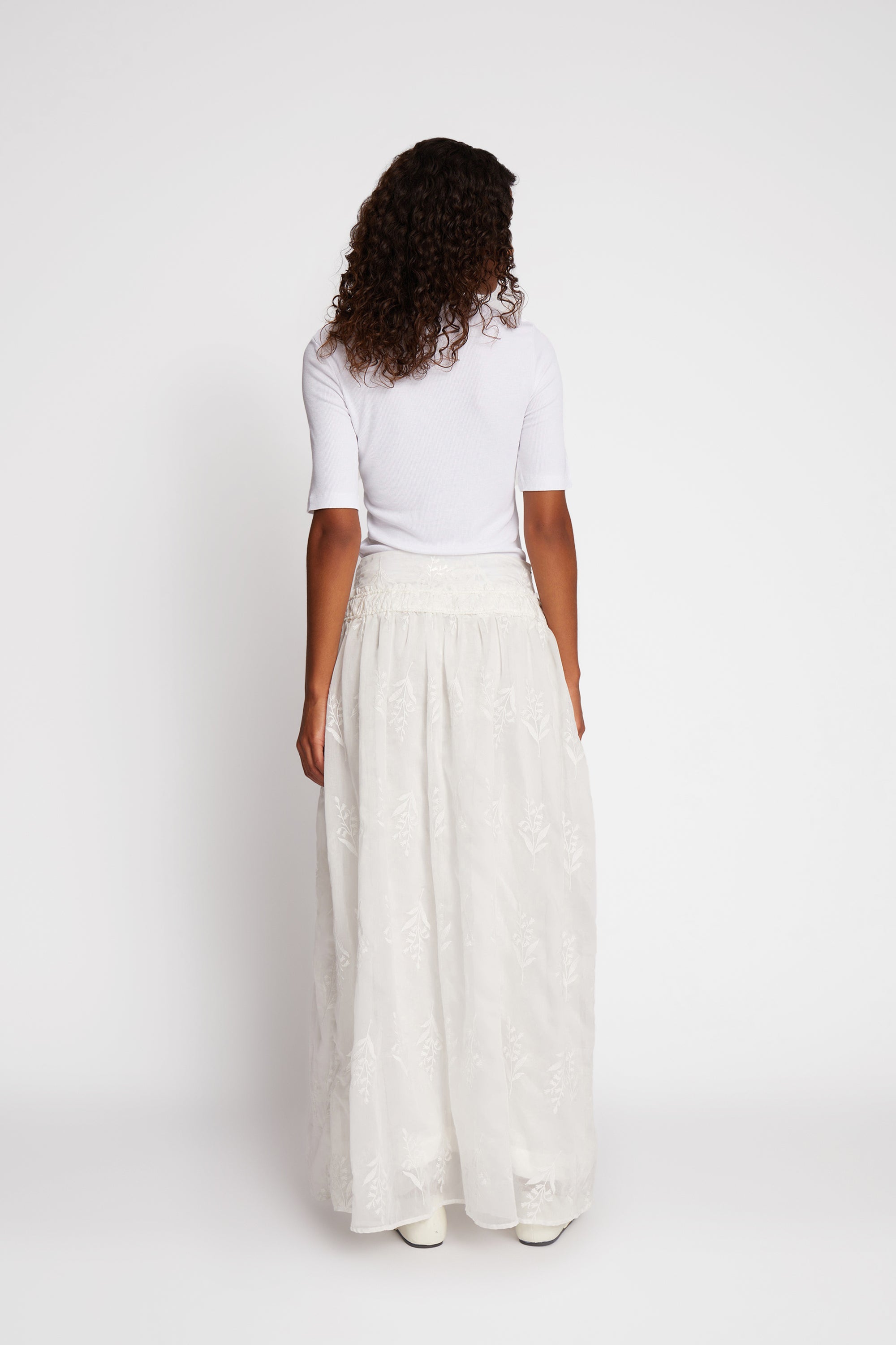 Skirt with a fine floral embroidery, and a beautiful tie detail at the hip. Each tie ends elegantly with small, fine tassels.