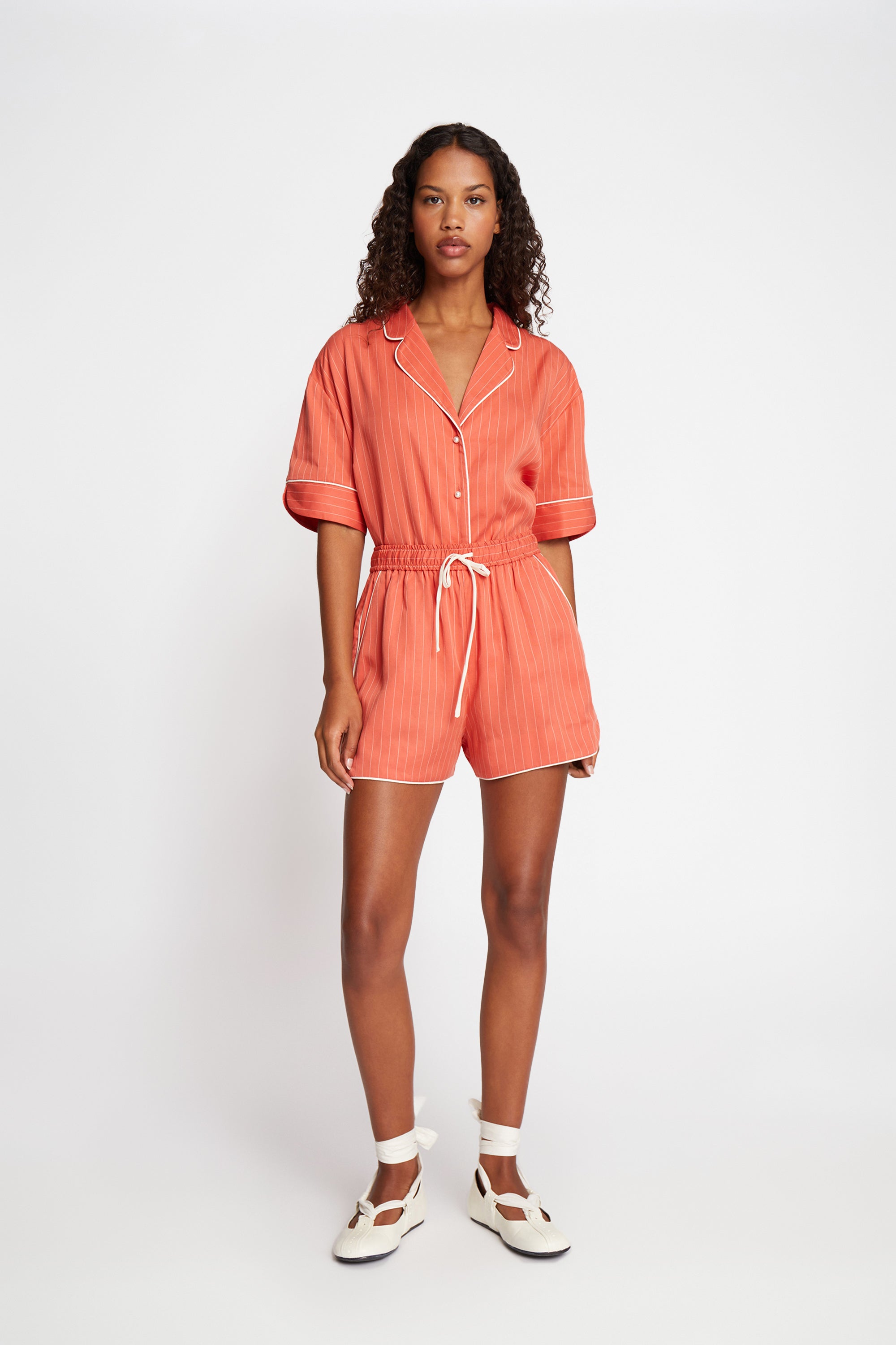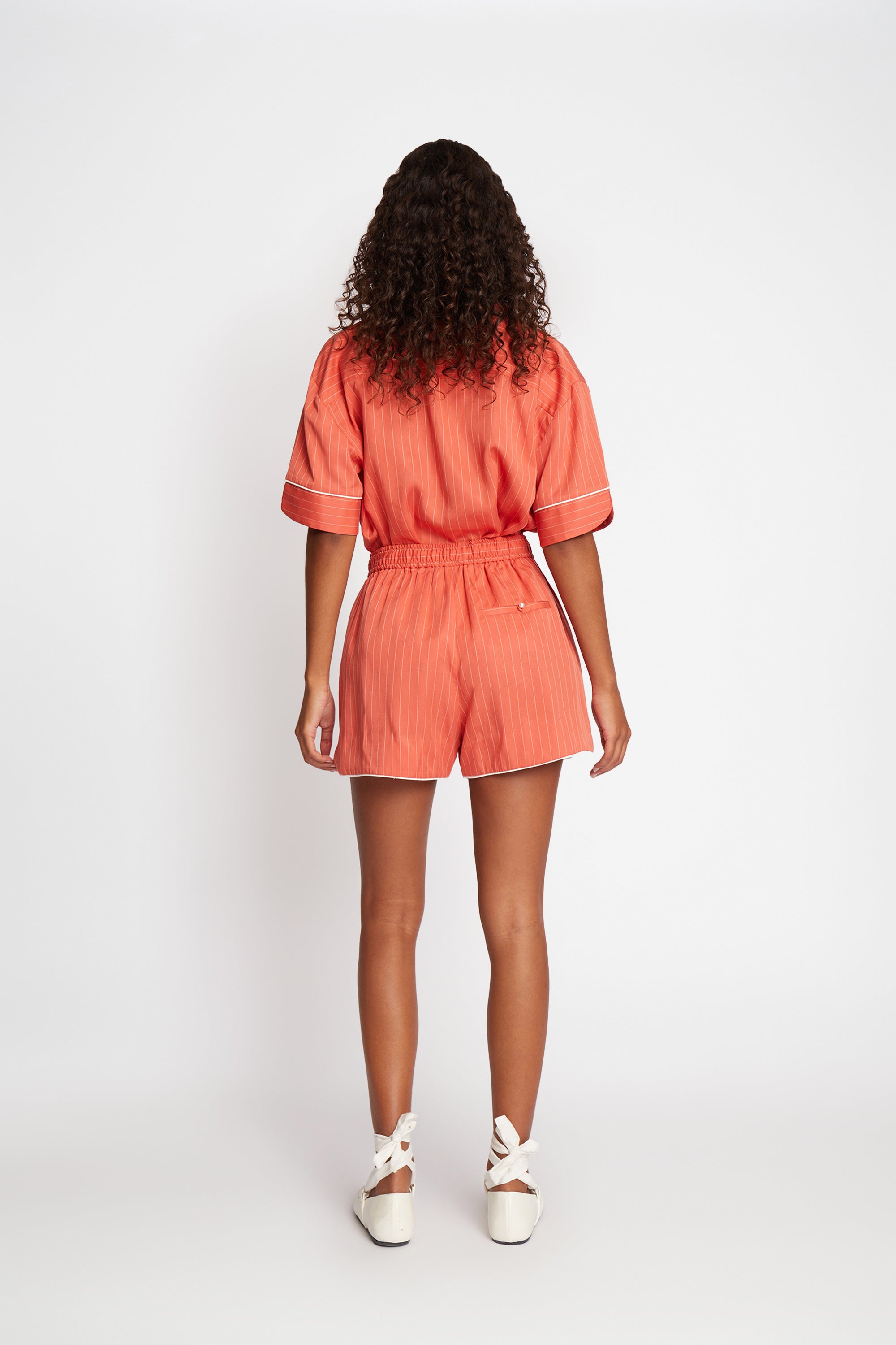 Elegant pinstriped shorts with beautiful white piping details. These shorts have pockets and are tied with a fine tie string at the waist.