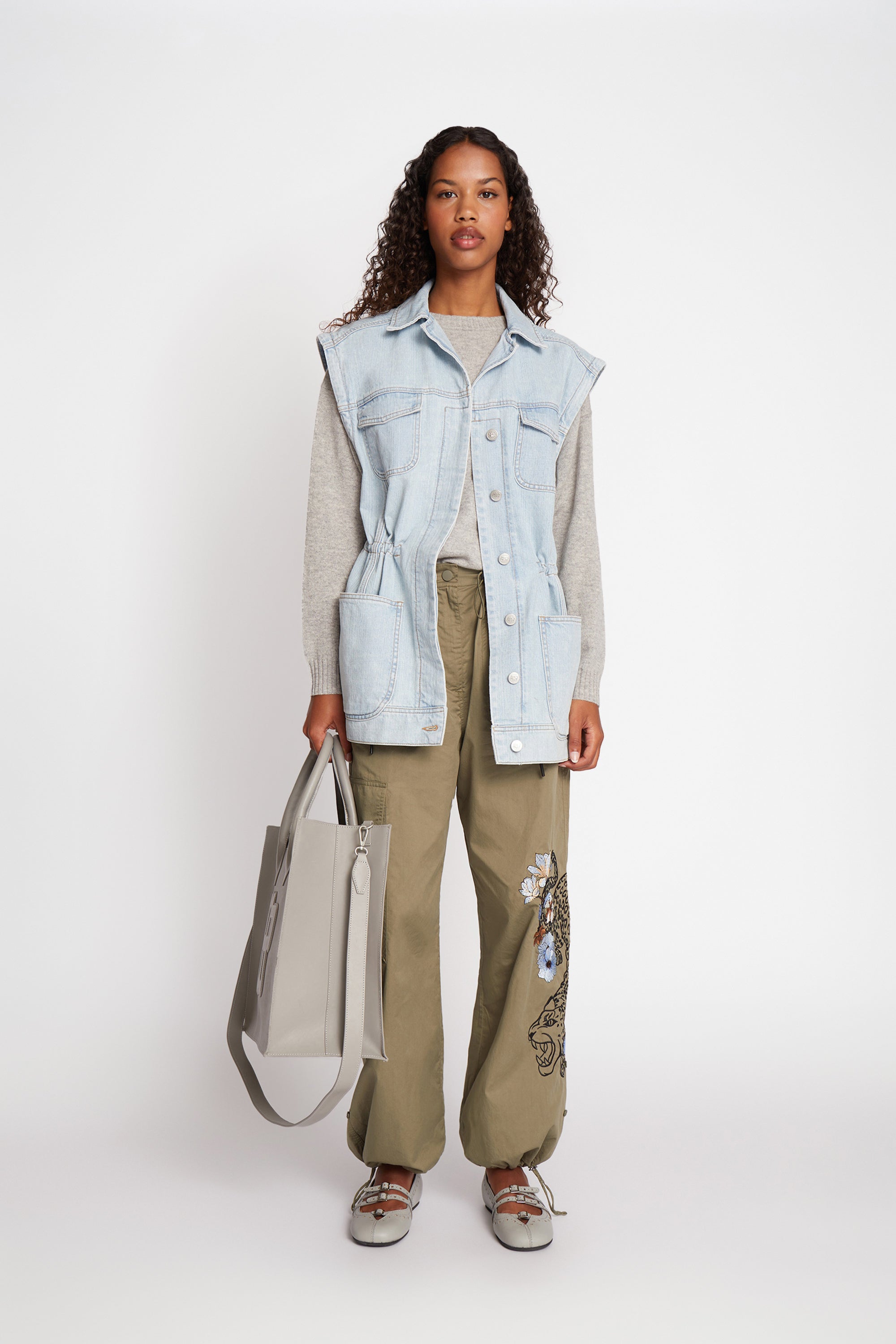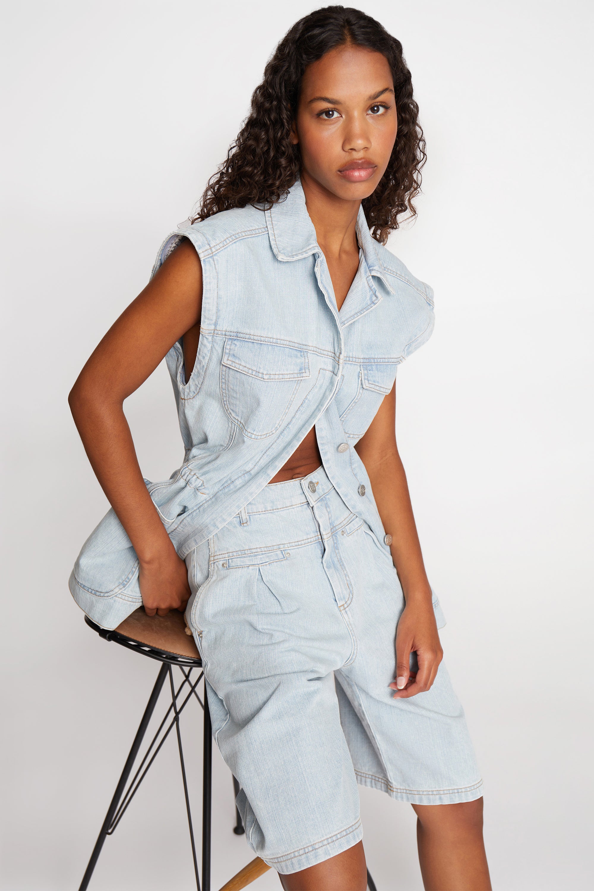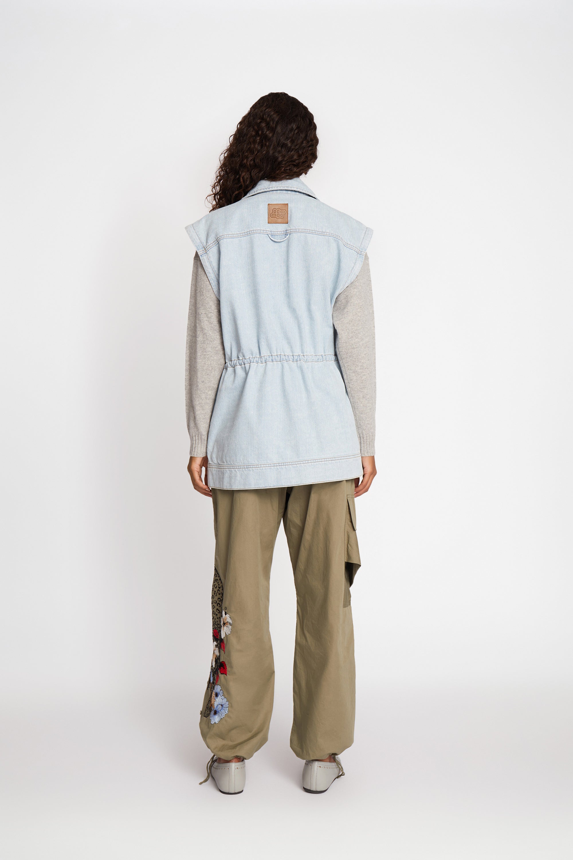 Denim vest with an elegant hidden button closure and a fine MUNTHE logo lining. The vest has four pockets and an adjustable drawstring at the waist for versatile styling options. This vest is designed for a loose fit.