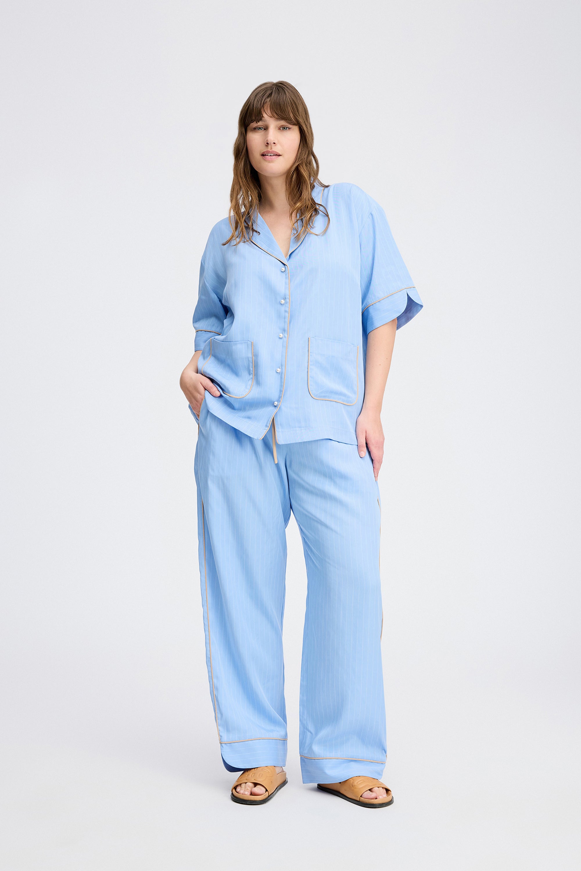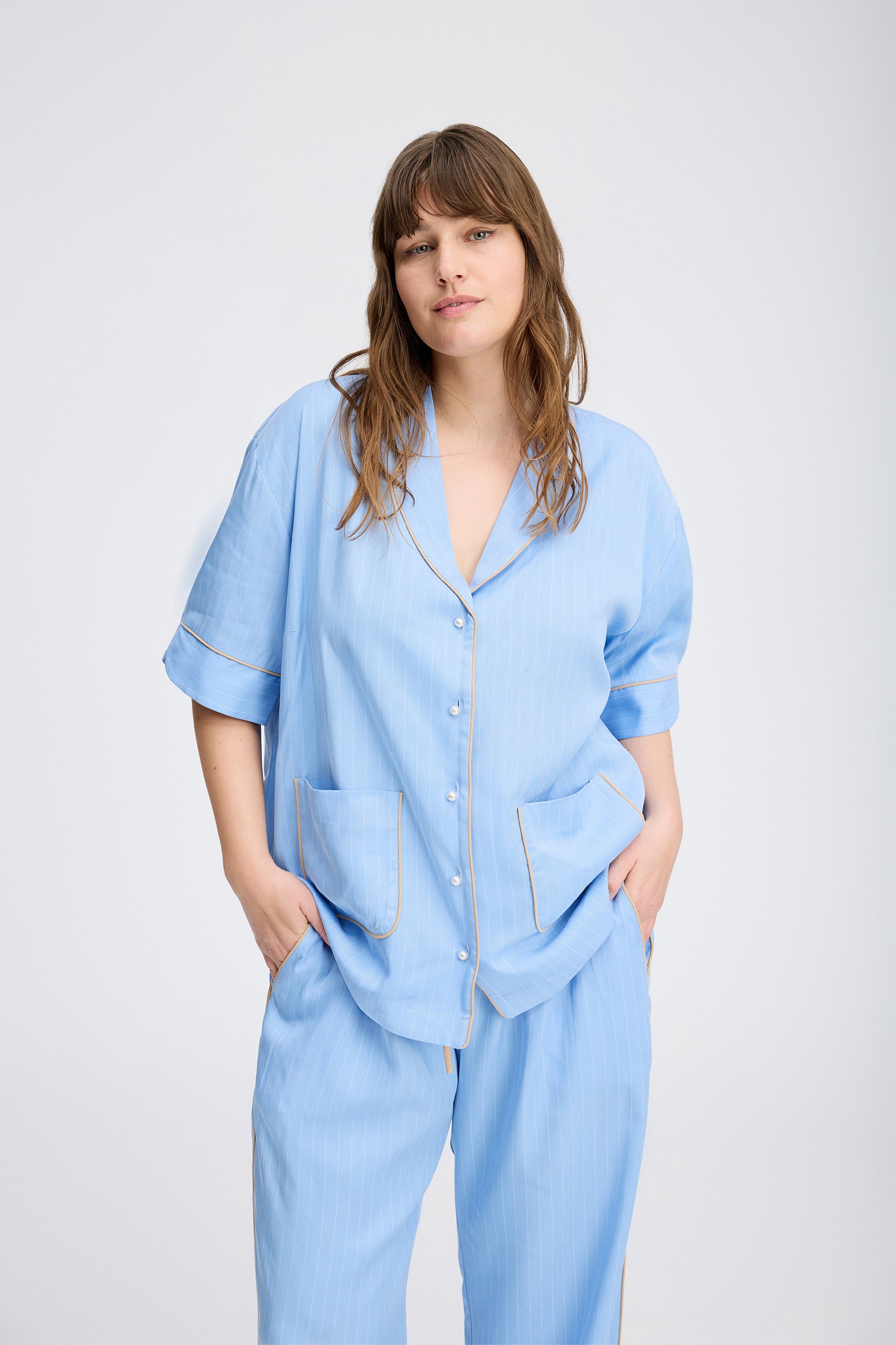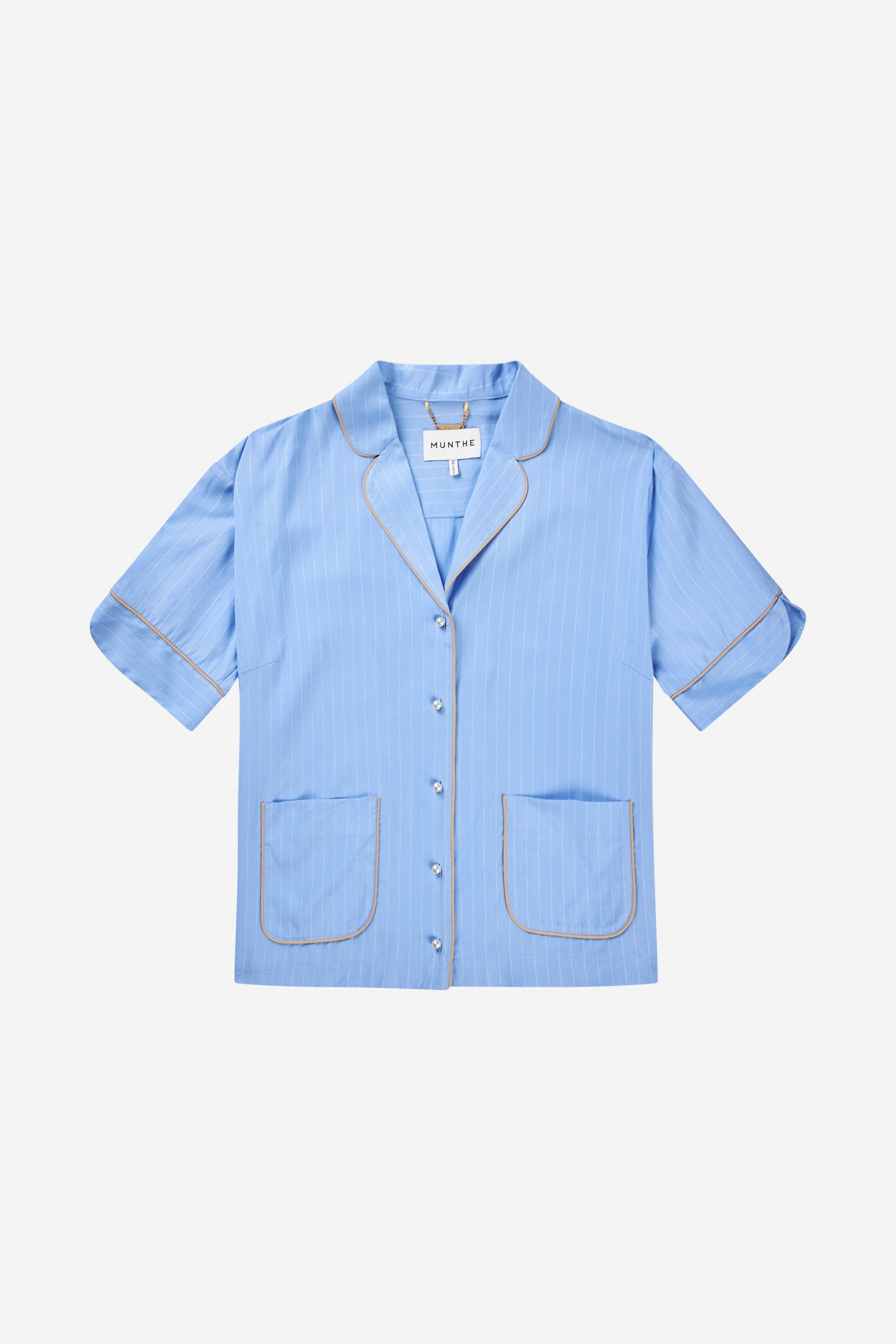 Pinstriped shirt blouse with beautiful beige piping, and elegant pearl buttons. The shirt blouse is designed with 2 fine pockets and elegant details on the sleeve.