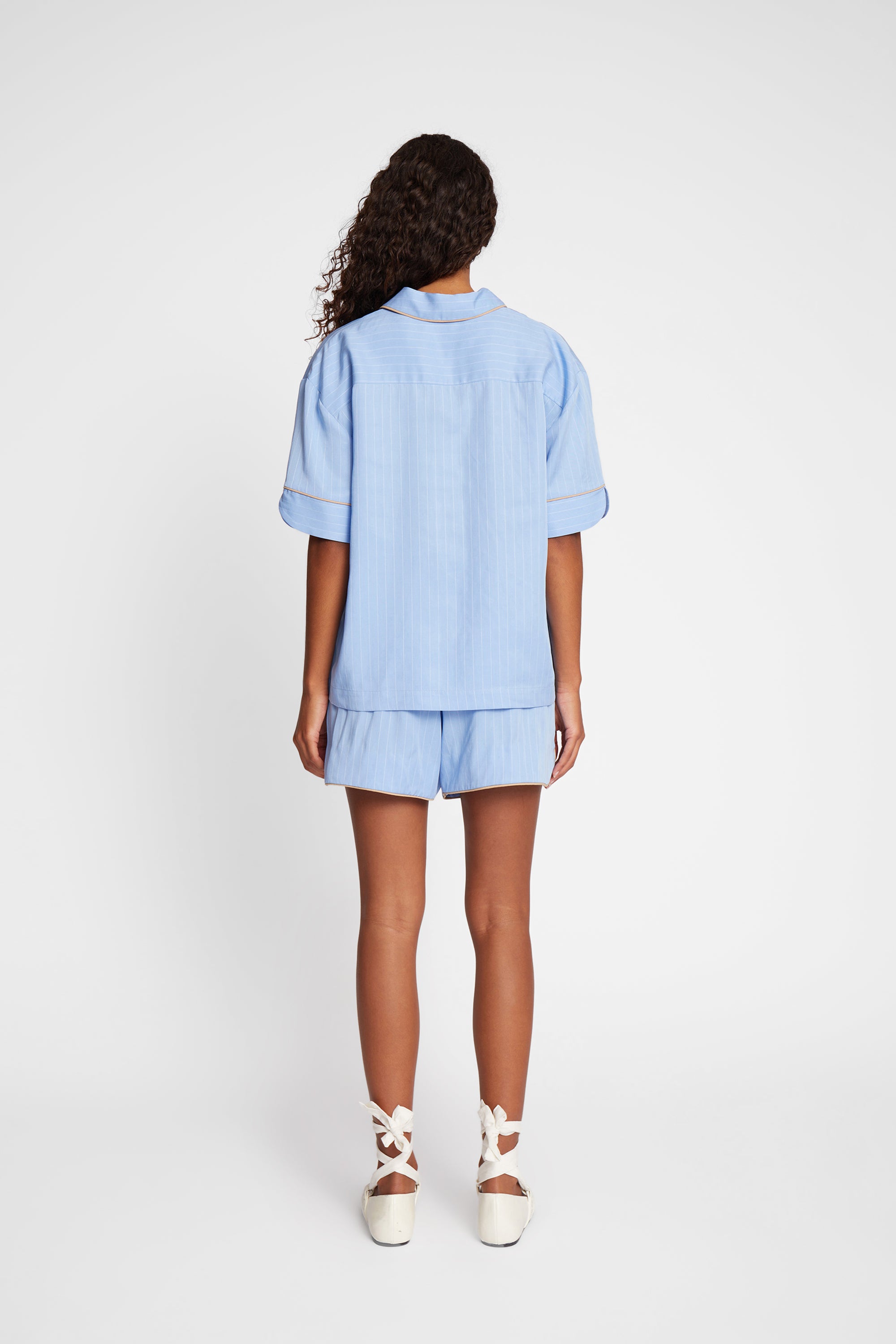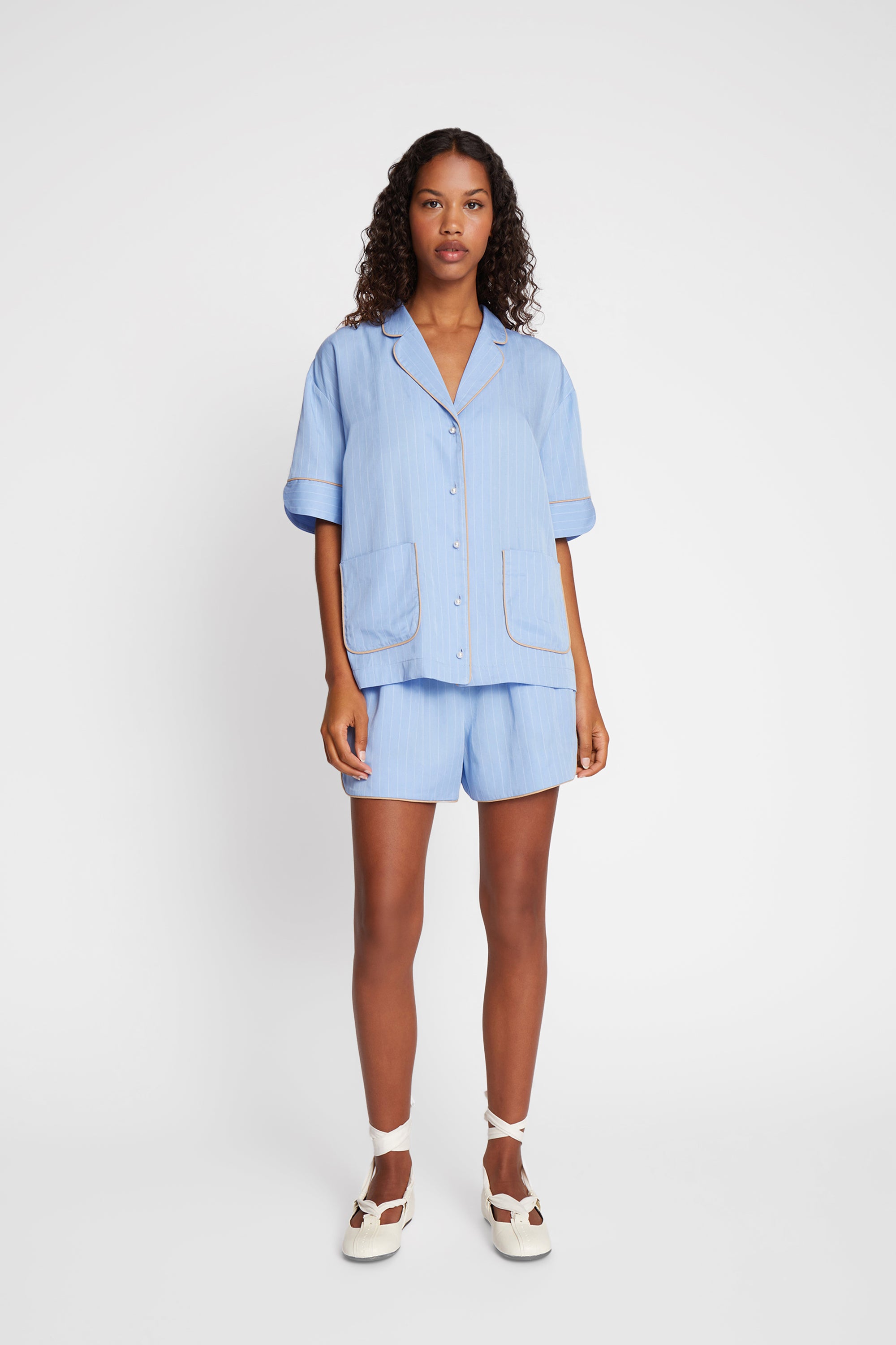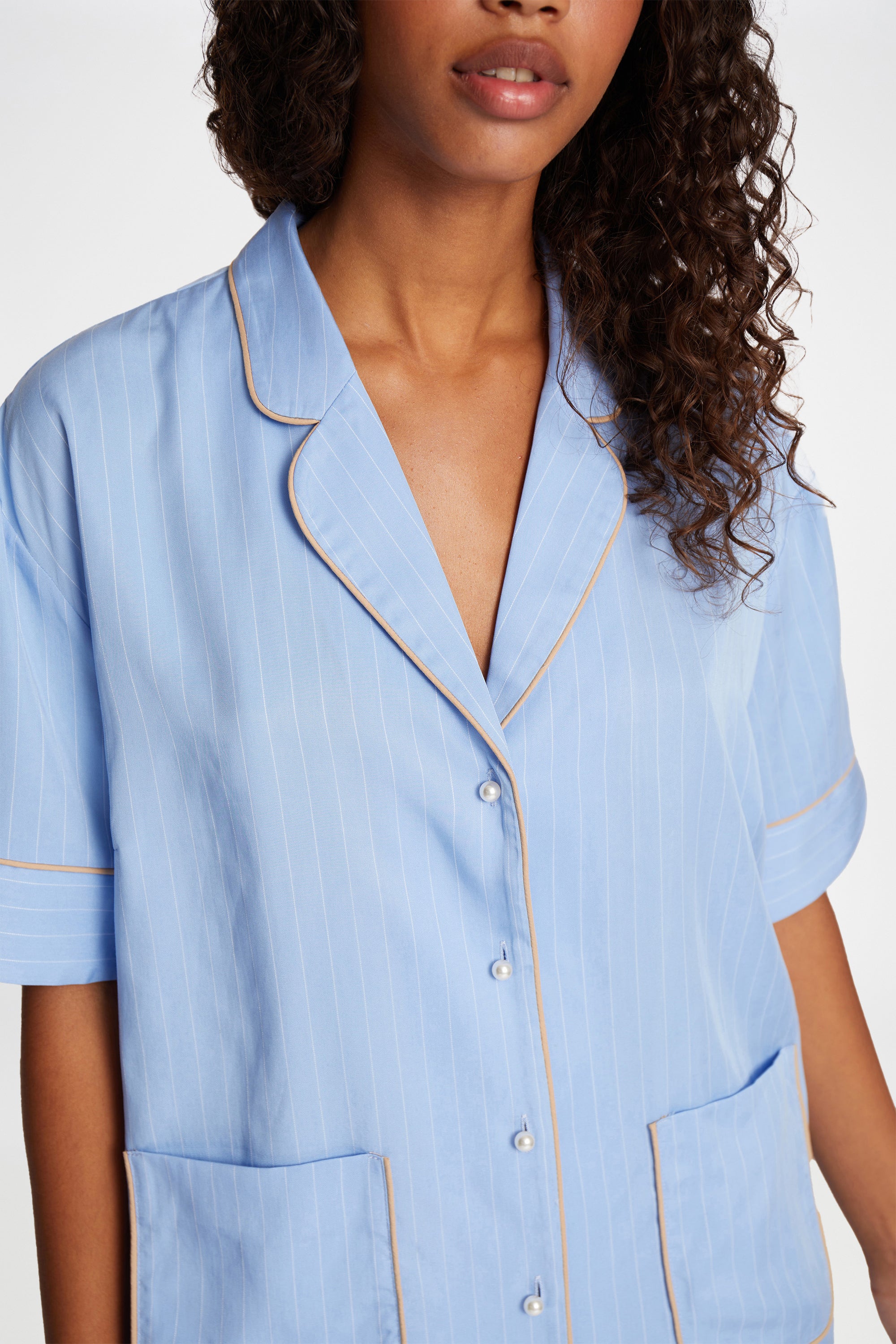 Pinstriped shirt blouse with beautiful beige piping, and elegant pearl buttons. The shirt blouse is designed with 2 fine pockets and elegant details on the sleeve.