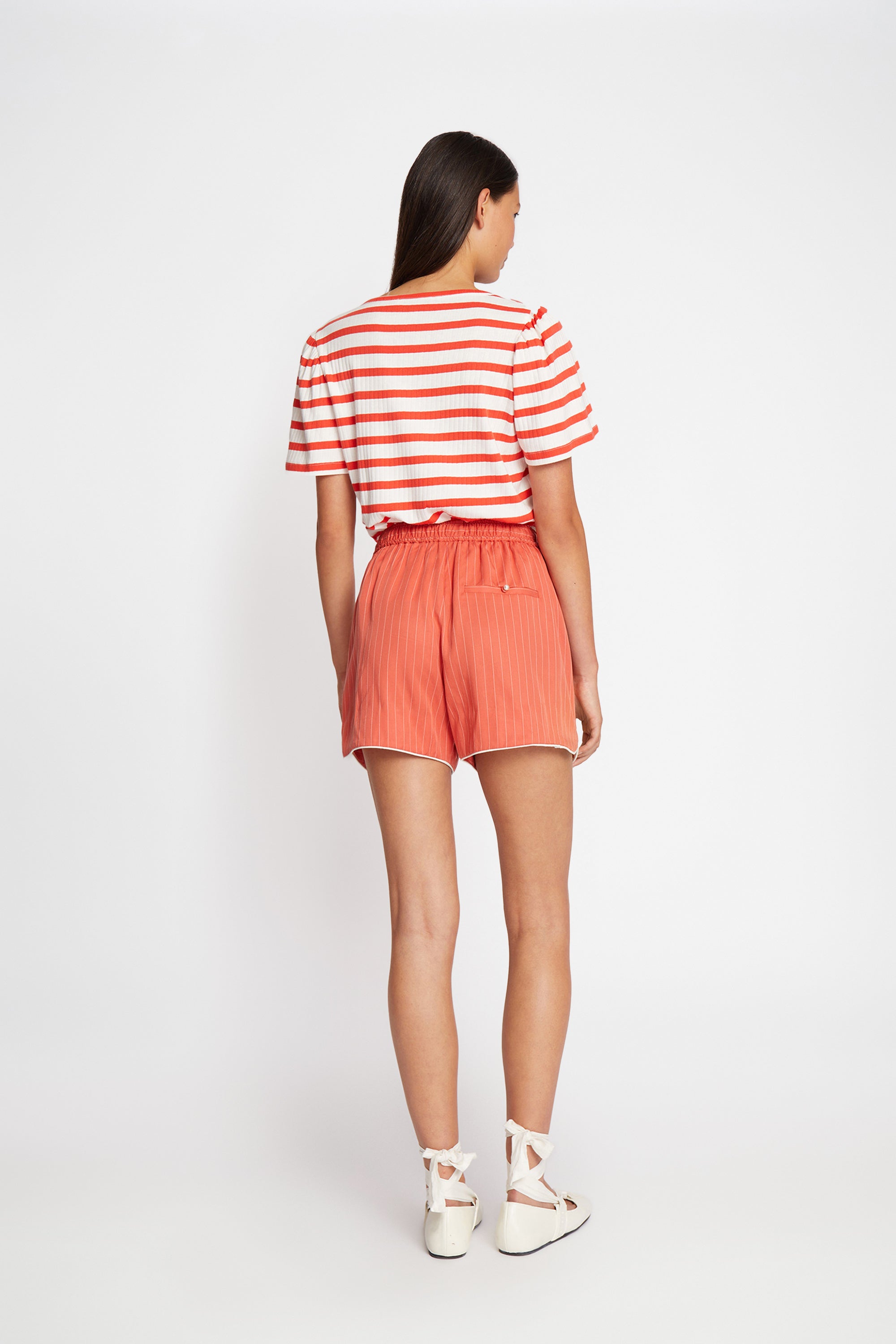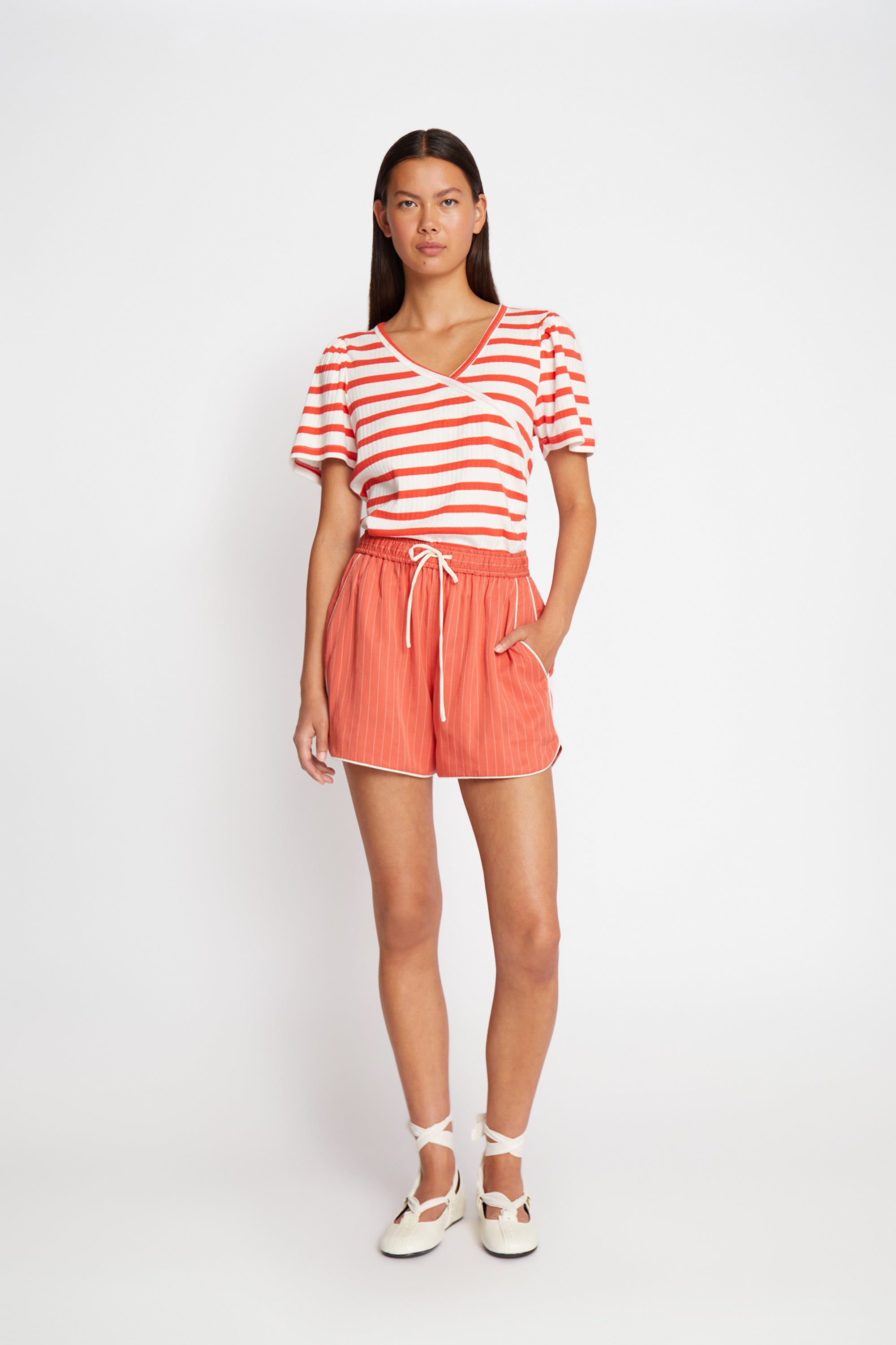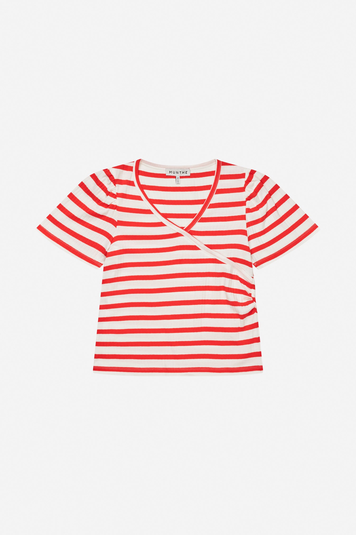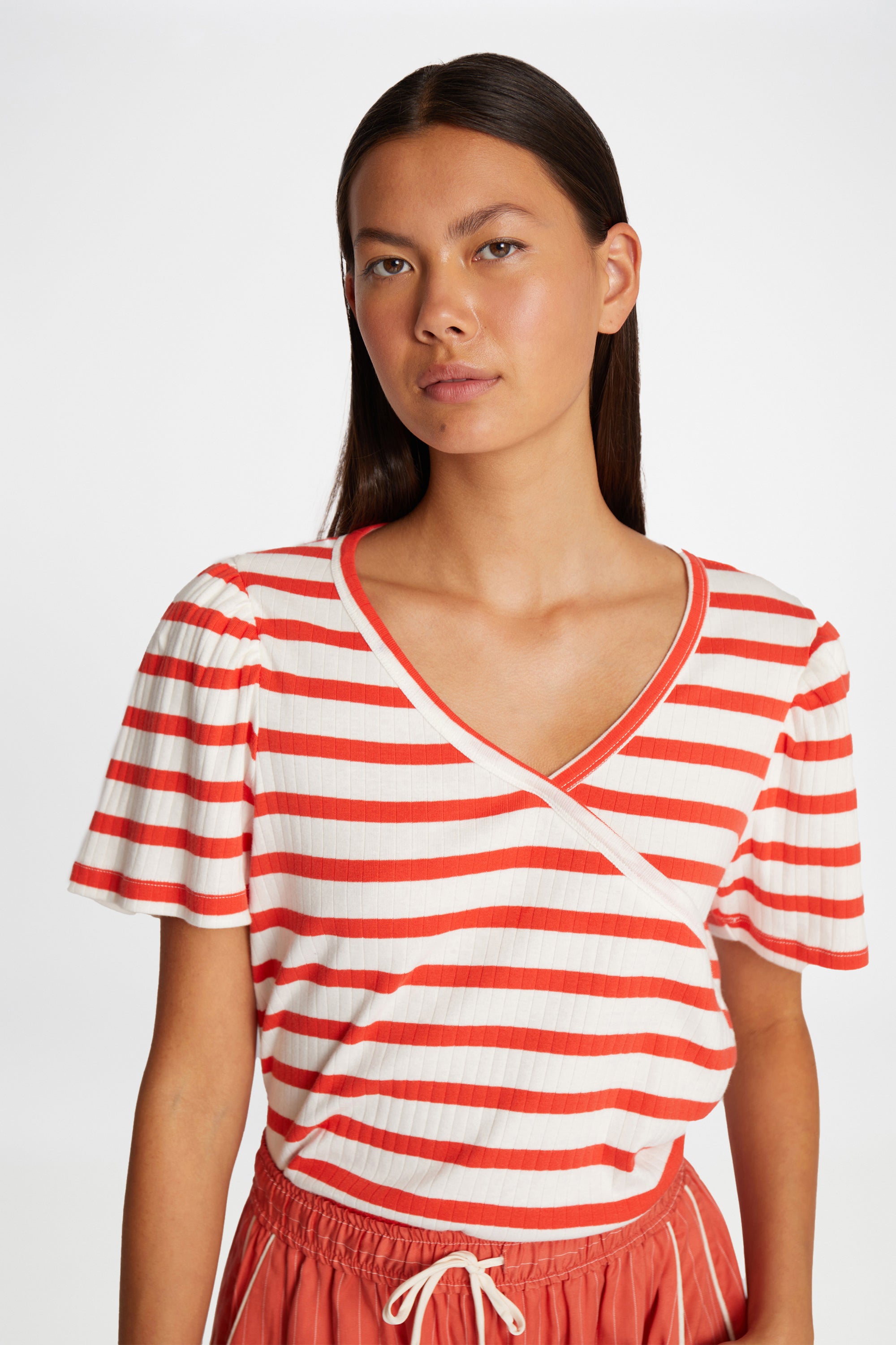 Striped T-shirt in 100% organic cotton with an elegant wrap effect. This T-shirt has a regular fit and short sleeves with a slight puff at the shoulder.